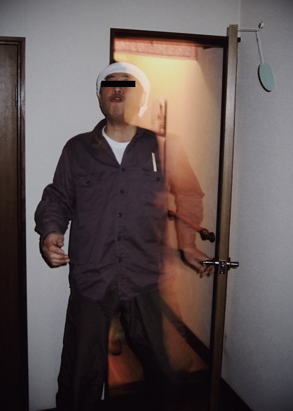 身体が透明化して彼の左手は奥にある手すりをも通り抜けています。