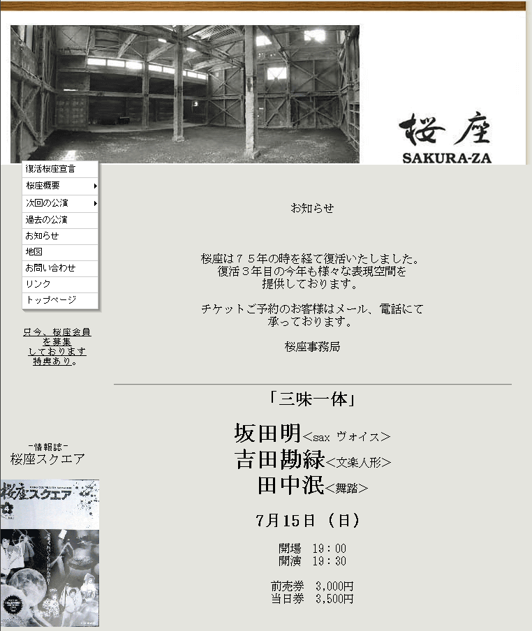 14日のダンスイベントに続いて、15日はJazz Saxの坂田明、文楽人形の吉田勘緑、舞踏家の田中泯のコラボレーション『三味一体』を観に行ってきました。